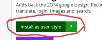 Adds back the 2014 google design. Changes google search, maps, translate, login, news, drive, shopping, photos, classroom and lens. ## DO NOT EXPECT MANY MORE UPDATES, GOOGLE HAS GONE TOO FAR SOUTH!! Also install "google 2014 row" for better search filter experience
