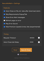 I have rewritten & modified StrangeT's Nexus No Wait script with a few extra features, this includes automatically closing a tab once download has started, and notifing the user via a Javascript alert if the download has failed. (or other errors)