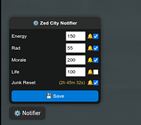 Zed City notifier with toolbar icon, sound alerts, and junk store countdown