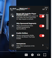 Removes YouTube’s new “Delhi” player experiment flags to restore the old video player UI. In English, this userscript brings back the Youtube UI we all know and love. This was developed due to many users like myself wanting a free method to get rid of the new video player change Youtube has forced on us. This userscript also comes with Return Youtube Dislike, Skip Sponsored Segments via Sponsorblock & many tweaks, all of which are toggleable.