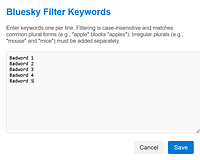 Enhance your Bluesky feed with advanced content filtering. Hides posts based on a customizable blocklist with case-insensitive and plural matching. Filters content by author names, author profiles, post text, and image alt-text. Features a user-friendly configuration interface, and real-time monitoring of dynamically loaded content for a tailored and seamless browsing experience.