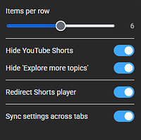 Enhances your YouTube experience. Customize the video grid layout by adjusting thumbnails per row, hide Shorts content, and automatically redirect the Shorts player to the standard video player.